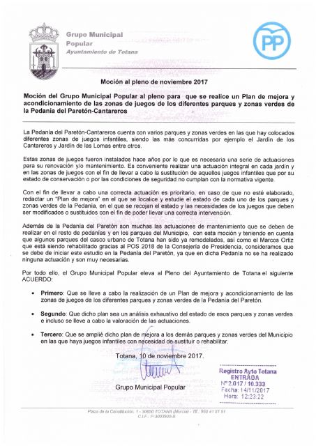 El PP presentaba el pasado 14 de noviembre una moción al pleno para que se realizase un Plan de mejora y acondicionamiento de las zonas de juegos de los diferentes parques y zonas verdes de la Pedanía del Paretón-Cantareros, y que fuese posteriormente ampliado al resto del Municipio, a la que el Alcalde no ha dado trámite.