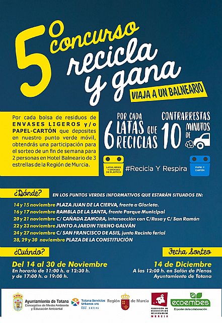 Los vecinos de Totana pueden participar durante las próximas semanas de noviembre en el concurso “Recicla y gana” para incentivar el reciclaje de residuos, dentro de la campaña de información y sensibilización ambiental que el Ayuntamiento de Totana realiza en colaboración con la empresa “Ecoembalajes España, SA” (Ecoembes) con el fin último de incentivar la reducción de residuos sólidos urbanos, la separación en origen y el consiguiente reciclaje de envases.