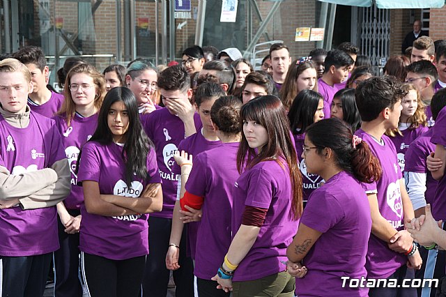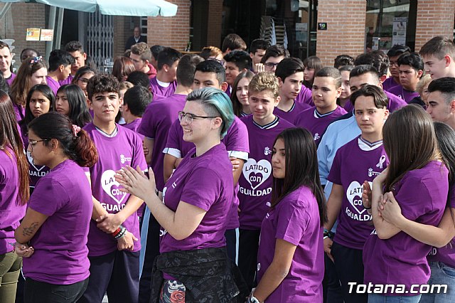 Alumnos y alumnas de Educación Secundaria de los diferentes centros de enseñanza de Totana formaron hoy un corazón humano en la plaza de la Balsa Vieja de esta ciudad para escenificar sus "latidos" contra la Violencia de Género, como colofón a las actividades de sensibilización que han celebrado durante estas semanas.