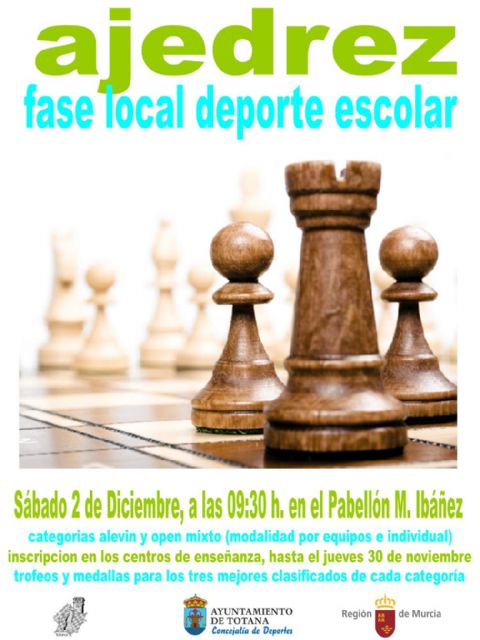 La Concejalía de Deportes y el Club de Ajedrez Totana organizan mañana sábado 2 de diciembre, a partir de las 9:30 horas de la mañana, la Fase Local de Ajedrez de Deporte Escolar, en el Pabellón Municipal de Deportes "Manolo Ibañez".