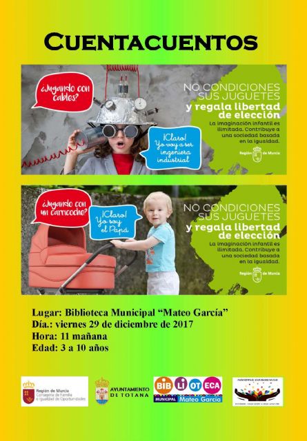 La actividad del 26 de diciembre se denomina "Cuentitis Navideño", incluido dentro del programa de Navidad y Reyes "Totana en Navidad. ¡Disfrútala!". Y el Cuentacuentos de día 29 está enmarcado dentro de la campaña lanzada por la Consejería de Familia e Igualdad contra el uso sexista del juguete de cara a las compras de Navidad.La Consejería ha promovido una campaña, de cara a las compras de Navidad, para fomentar la elección de juguetes sin estereotipos de género que limiten el desarrollo de la personalidad de los niños y niñas, con la que se pretende promover el consumo de juguetes que permitan desarrollar libremente sus capacidades y aptitudes para el presente y el futuro, además de fomentar la igualdad desde la edad temprana a través del juego.