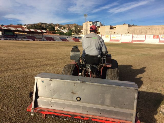 La Concejalía de Deportes del Ayuntamiento de Totana está acometiendo durante estos días, aprovechando el parón liguero, trabajos de resiembra del césped natural en el campo de fútbol del estadio municipal "Juan Cayuela" de esta localidad, con el fin de garantizar su conservación y mantenimiento hasta el final de esta temporada.