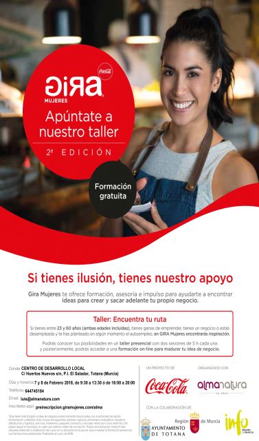 La multinacional "Coca-Cola" va a organizar en Totana los próximos días 7 y 8 de febrero el Taller "Encuentra tu ruta" dentro del programa "Gira Mujeres", que tendrá lugar en el Centro de Desarrollo Local, y con el que se pretende ofrecer formación, asesoría e impulso a las mujeres emprendedoras para ayudarles a encontrar ideas que permitan crear y sacar su propio negocio.