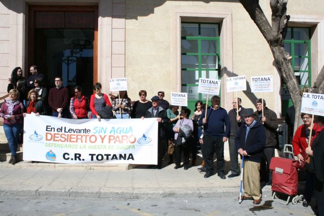 Cerca de 300 personas, según fuentes de la Policía Local, se concentraron hoy en la plaza de la Constitución, a las puertas del Ayuntamiento de Totana, realizando un paro simbólico de cinco minutos para apoyar la manifestación convocada en Madrid en favor de medidas concretas por parte de la Administración para paliar la falta de recursos hídricos en el campo murciano a consecuencia de la sequía.