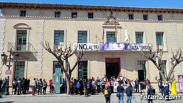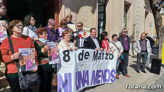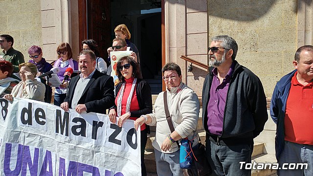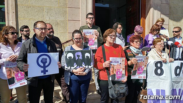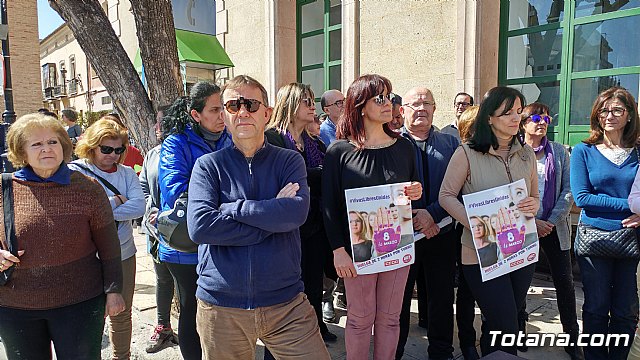 Autoridades del Gobierno municipal participaron esta mañana en el acto de apoyo a la huelga general parcial convocada por las organizaciones sindicales UGT y CCOO en el Ayuntamiento de Totana con motivo de la celebración del Día Internacional de la Mujer, que se conmemora hoy 8 de marzo.