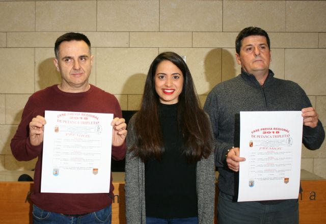 La concejal de Deportes, Isabel María Molino, el presidente del Club de Petanca "Santa Eulalia", Juan Tudela, y su vicepresidente, Diego Ángel Méndez, presentaron esta competición que se celebrará los días 11, 18 y 25 de marzo por la mañana, y cuenta con la inestimable colaboración de la Federación de Petanca de la Región de Murcia.