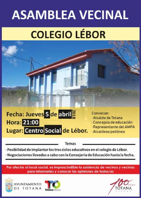 El Centro Social de Lébor acoge mañana jueves, día 5 de abril, a partir de las 21:00 horas, una asamblea vecinal para tratar asuntos relacionados en materia de Educación con esta pedanía, a la que están convocados los vecinos y vecinas y miembros de la comunidad educativa de Lébor.