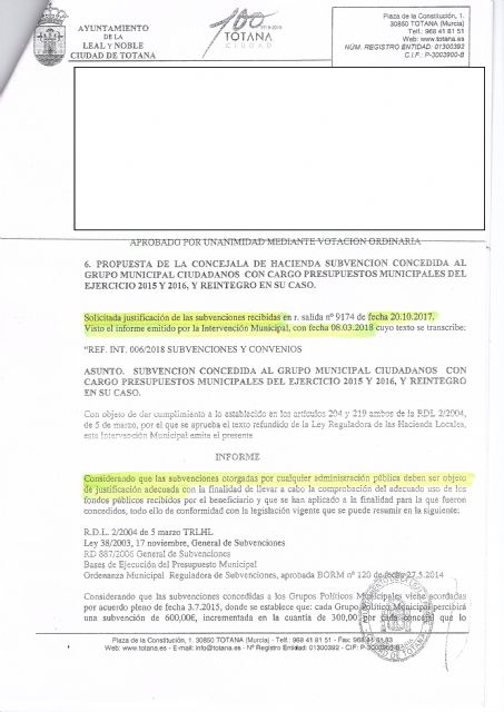 En septiembre de 2017 hacía tres meses de la toma de mí acta de Concejal por baja del n°1 de la lista del partido Ciudadanos Totana y es cuando recibo el justificante de pago que adjunto a la atención del Grupo Político municipal. Grupo que jamás se debería de haber constituido bajo ese nombre sino como Grupo Mixto al no obtener ni los representantes suficientes, ni los votos necesarios. Desde el momento de la toma de mi acta mínimo, el Ayuntamiento debería de haber dejado de ingresar nada a nombre de este grupo político. Al calificarme como Concejal "no adscrito" a grupo político alguno, ya no tenían derecho a esas subvenciones.