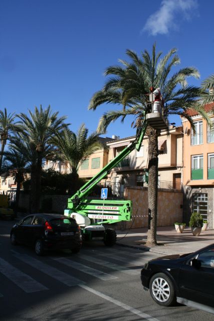 Operarios de la Concejalía de Servicios a la Ciudad e Infraestructuras están procediendo durante estos días a los trabajos de poda y mantenimiento de la población de palmeras en las vías públicas y en los parques y jardines de Totana. Esta semana se están centrando los trabajos en la población de palmeras de la avenida de Lorca de esta localidad.