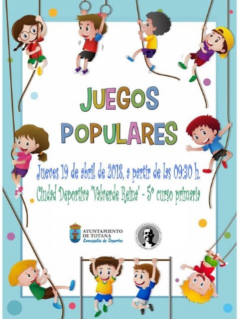 La Concejalía de Deportes tiene previsto organizar mañana jueves 19 de abril en la Ciudad Deportiva "Valverde Reina", una Jornada de Juegos Populares, en colaboración con el TAFAD del IES Miguel Hernández de Alhama, donde participarán los alumnos de 5º curso de primaria de todos los centros de enseñanza de la localidad.