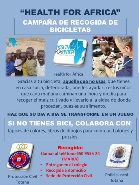 La Policía Local de Totana está presentado durante estos días en los diferentes centros escolares del municipio una campaña solidaria para promover la recogida de bicicletas usadas y material escolar y sanitario reutilizable destinado para la ONG “Health for Africa”, una asociación internacional de nueva creación que viene trabajando desde mediados de este año en el desarrollo y acción de programas de promoción de la mejora de las condiciones sanitarias del continente africano.