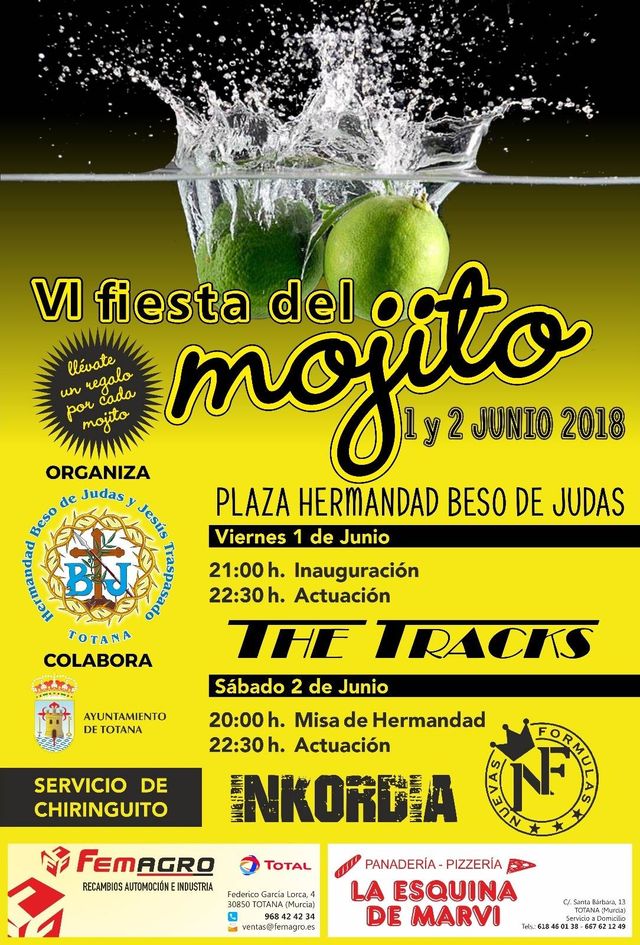 La VI Fiesta del Mojito, organizada por la Hermandad Beso de Judas y Jesús Traspasado y que cuenta con la colaboración del Ayuntamiento de Totana, tendrá lugar este próximo fin de semana, los días 1 y 2 de junio.