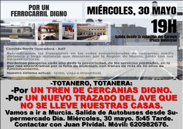 Desde Ganar Totana fomentamos una campaña de apoyo y solidaridad con las reivindicaciones de los Sindicatos presentes en el Comité de RENFE-ADIF para conseguir mejoras en los Servicios de Cercanías que realmente interesan y son utilizados por la mayoría social de Totana y la Región de Murcia. Hacemos un llamamiento a la participación en esta y en todas las manifestaciones que se organicen en adelante.