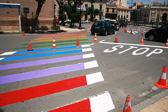 La Concejalía de Igualdad y Defensa de los Derechos del Colectivo LGTBI del Ayuntamiento de Totana ha repintado, finalmente, dos pasos de peatones con los seis colores de la bandera arcoíris en la céntrica plaza de la Constitución de esta localidad coincidiendo la próxima semana con la celebración de la Semana por el Respeto y la Igualdad del Colectivo LGTBI en este municipio.