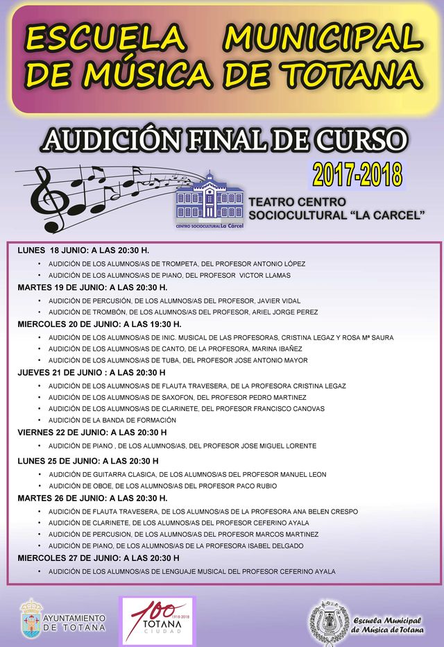 Un total de diecinueve audiciones de distintas disciplinas musicales tienen lugar desde el pasado lunes 18 hasta el miércoles 27 de junio con motivo de la clausura del curso 2017/2018 de la Escuela de Música de Totana, que tendrán lugar en el Teatro "Ginés Rosa" del Centro Sociocultural "La Cárcel".
