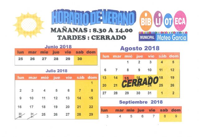 Desde el lunes 25 de junio hasta el 7 de septiembre el horario de la biblioteca será, de 8:30 a 14:00 horas, permaneciendo cerrada por las tardes.