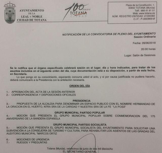Además, se debatirán las mociones del Grupo Municipal Popular sobre conmemoración del 175 aniversario de la bandera española y de Grupo Municipal Socialista para solicitar una subvención a la Consejería de Turismo y Cultura para rehabilitar los asientos de las gradas del auditorio municipal "Marcos Ortiz".
