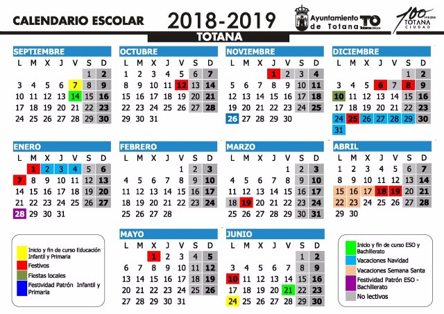 El curso escolar 2018/19 en el municipio de Totana comenzará en Educación Infantil y Primaria el próximo 7 de septiembre; y en la Educación Secundaria Obligatoria (ESO) y Bachillerato el 14 y en Formación Profesional (FP) el 21 del mismo mes, según informan fuentes de la Concejalía de Educación.