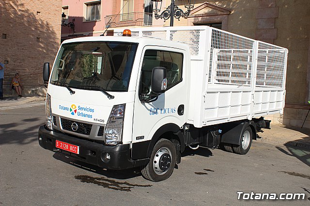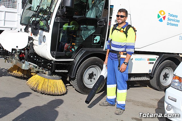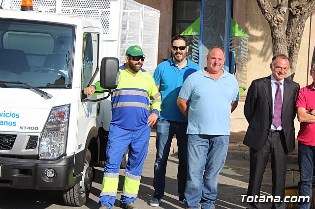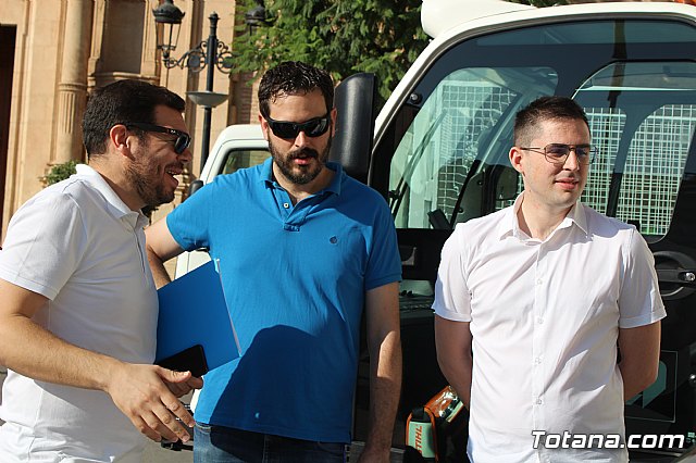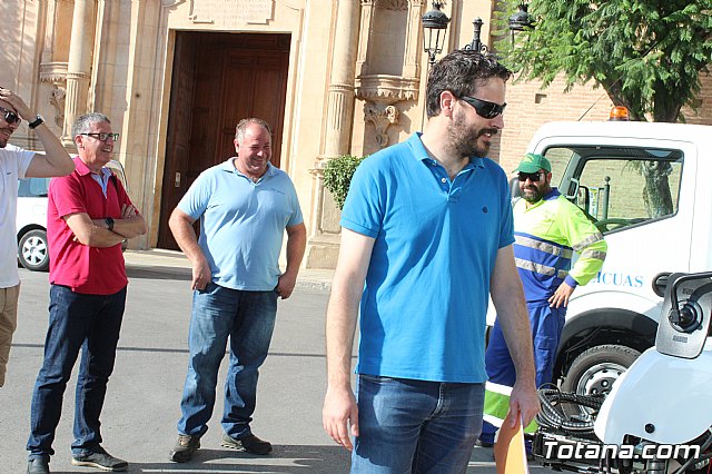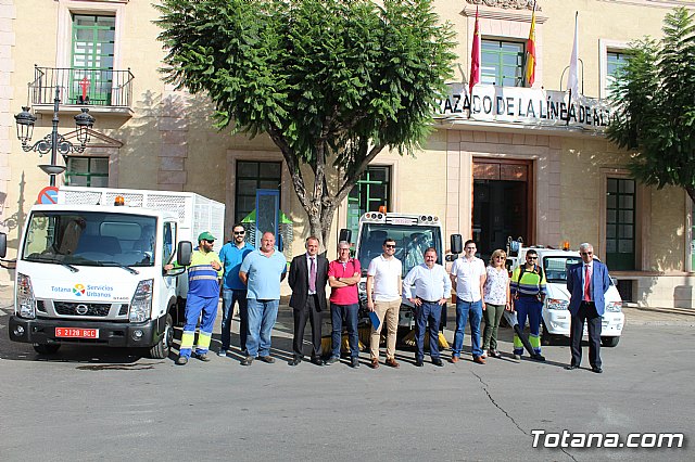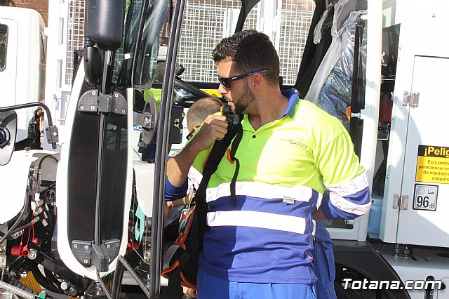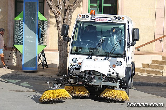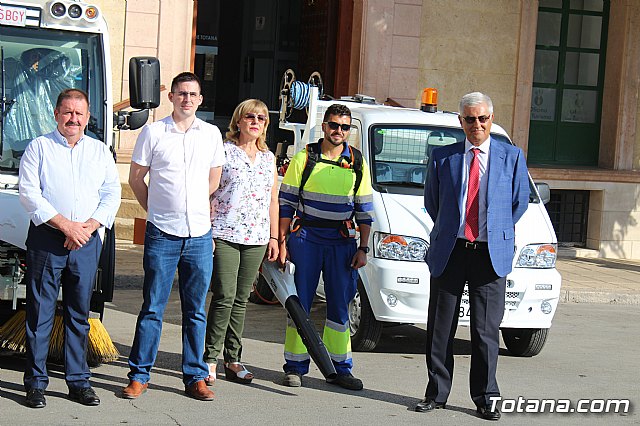 El alcalde, Andrés, García, y los concejales de Servicios a la Ciudad y Residuos Sólidos Urbanos (RSU), Víctor Balsas y Antonia Camacho, acompañados por los directivos de la adjudicataria de dicho servicio, han dado cuenta de las características técnicas de la nueva maquinaria que han sido presentada a las puertas del Consistorio totanero, en la plaza de la Constitución.