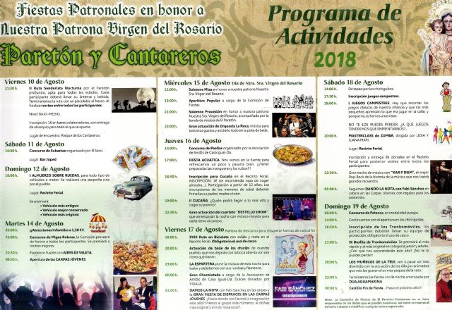 Más de una treintena actividades conforman el programa de fiestas patronales de El Paretón-Cantareros, en honor a la Virgen del Rosario, que se celebran desde hoy y hasta el 19 de agosto con un ambicioso y numeroso elenco de actos, organizadas por la Comisión de Fiestas de esta pedanía.