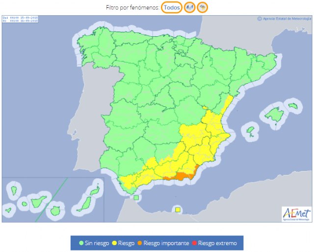 A esta hora tenemos activado el aviso amarillo en toda la Región de Murcia para mañana por tormentas y lluvias que pueden descargar 20mm/h. El aviso podrá ser actualizado en función de la evolución de la situación.