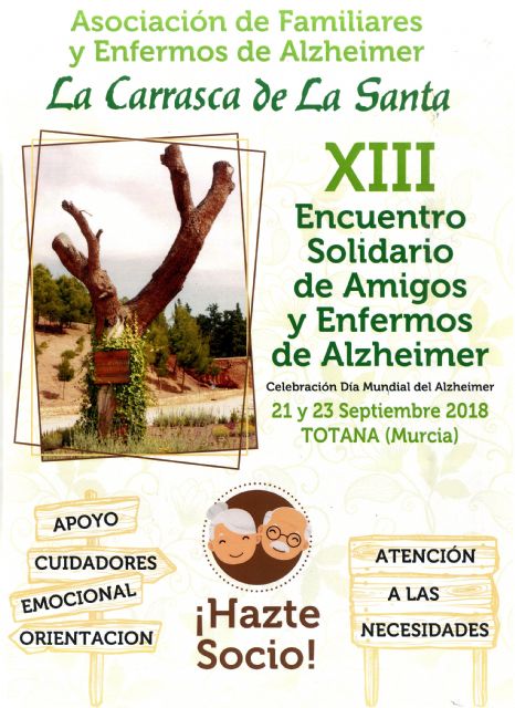 La Asociación de Familiares y Enfermos de Alzheimer "La Carrasca de La Santa" de Totana (AFAT) organiza del 21 al 23 de septiembre el programa de actividades del XIII Encuentro Solidario con motivo de la celebración del Día Mundial del Alzheimer, según informan fuentes de la Concejalía de Personas Mayores.