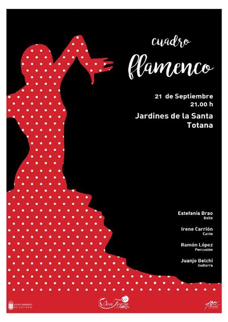 La Concejalía de Cultura recuerda que mañana viernes, 21 de septiembre, va a tener lugar el espectáculo "Cuadro flamenco" (21:00 horas), en el patio interior del "Hotel Jardines de La Santa", con la actuación de Estefanía Brao (baile), Irene Carrión (cante), Ramón López (percusión) y Juanjo Belchí (guitarra), miembros de la Asociación Musical "Con Forza".