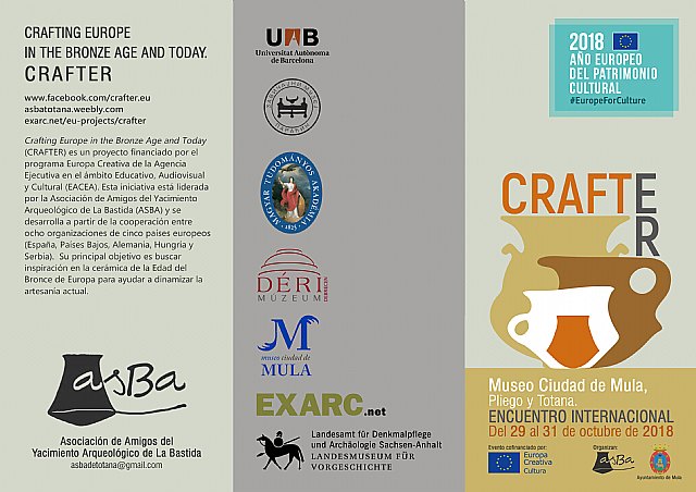 CRAFTER es uno de los dos proyectos con liderazgo español premiados este año por la convocatoria de Europa Creativa. La entidad que coordina el proyecto, ASBA, es una asociación sin ánimo de lucro de Totana, dedicada a la promoción de la llamada sociedad de El Argar (2200-1550 antes de nuestra era). Además de ASBA y del Ayuntamiento de Mula, el proyecto tiene como socio español a la Universidad Autónoma de Barcelona, responsable de los contenidos arqueológicos y educativos. Las otras cinco entidades participantes son el Museo de Paraæin (Serbia), la Academia Húngara de Ciencias, el Museo Déri, de Debrecen (Hungría), la asociación EXARC (Países Bajos) y el Museo Estatal de Prehistoria de Halle (Alemania).