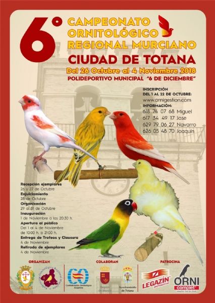 Totana acoge hasta el próximo 4 de noviembre el 6° Campeonato Ornitológico Regional Murciano que se celebrará en el Pabellón "Padres Capuchinos" del Polideportivo Municipal "6 de Diciembre" de esta localidad, y que albergará a más de 2.800 ejemplares y unos 200 criadores, algunos llegados de Alicante y Almería.