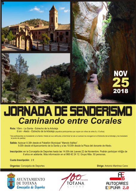 Las inscripciones tienen un coste de 2 euros por participante e incluye traslado en autocar y seguro de accidentes, se deben de formalizar en la Concejalía de Deportes hasta el jueves 22 de noviembre, de lunes a viernes, en horario de 9:00 a 14:00 horas. Más información en el teléfono 968 42 24 12 y en el email: cmunuera@totana.es