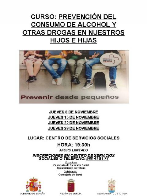 La Concejalía de Bienestar Social del Ayuntamiento de Totana, a través del Programa Municipal de Prevención de Drogodependencias, está ofertando el Curso titulado "Prevención del consumo de alcohol y otras drogas en nuestros hijos e hijas", que cuenta con la colaboración de la Consejería de Salud.