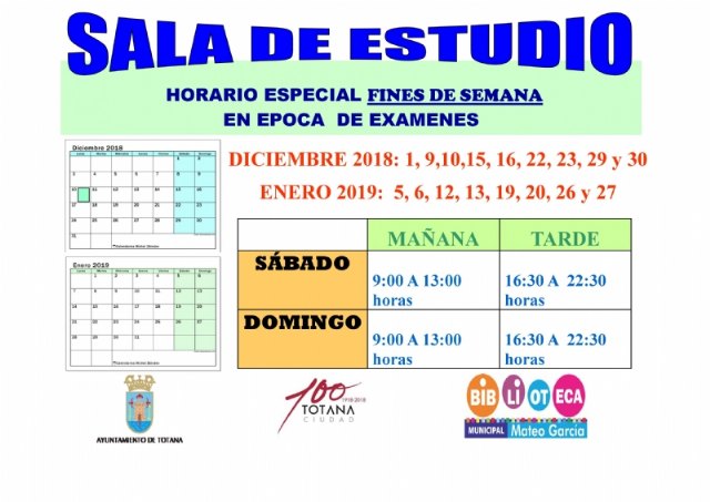 El horario especial para esta época de exámenes, durante los fines de semana o festivos, se fija de tal manera que se abre dicha infraestructura los días 1, 9, 10, 15, 16, 22, 23, 29 y 30 de diciembre; y los días 5, 6, 12, 13, 19, 20, 26 y 27 de enero.