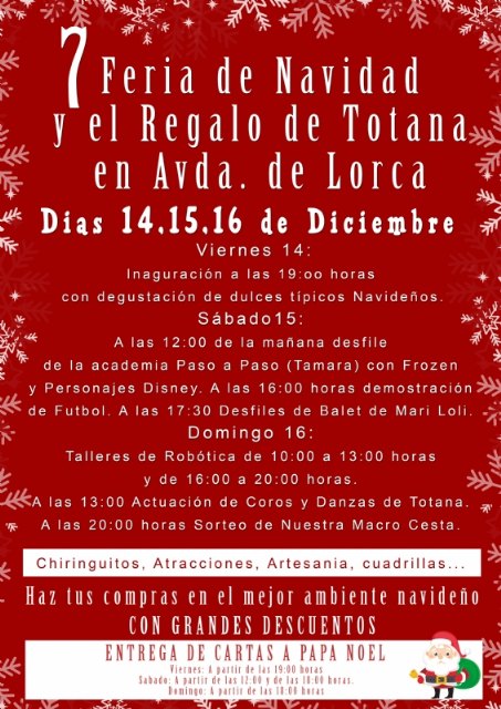 La 7ª Feria de Navidad y el Regalo de Totana, que se celebra en la avenida de Lorca, tiene lugar durante este próximo fin de semana, del 14 al 16 de diciembre, con la instalación de 25 comerciantes y artesanos y un atractivo programa de actividades con el que se quiere dinamizar esta zona comercial del casco urbano de cara a las compras de Navidad.