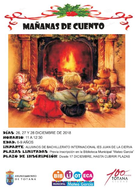 La Concejalía de Cultura organiza, con la colaboración de alumnos de la modalidad del Bachillerato Internacional del IES "Juan de la Cierva", la actividad "Mañanas de Cuento" del 26 al 28 de diciembre en la Biblioteca Municipal "Mateo García" de esta localidad.