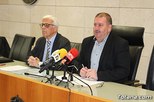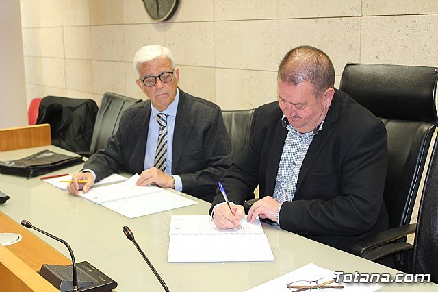 El alcalde de Totana, Andrés García, y el gerente regional de la Dirección General del Catastro en Murcia, Justo Parejo, suscribieron hoy un convenio de colaboración que permitirá a los usuarios de este municipio agilizar y simplificar los trámites en esta materia, cuyo acto se celebró en el salón de plenos municipal.