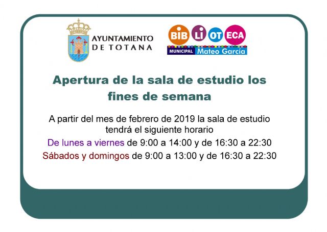 La Concejalía de Cultura del Ayuntamiento de Totana ha decidido mantener la apertura de la Sala de Estudio, ubicada en la primera planta del Centro Sociocultural "La Cárcel", durante los fines de semana a partir de este mes de febrero con el fin de darle continuidad a este servicio y dar respuesta a las demandas de los usuarios.