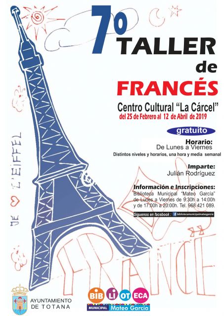 La Concejalía de Cultura organiza, a través de la Biblioteca Municipal "Mateo García", el 7° Taller de Francés, de carácter gratuito, que se celebrará del 25 de febrero al 12 de abril, en el Centro Sociocultural "La Cárcel", impartido por Julián Rodríguez.