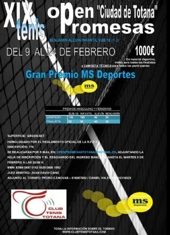 Este fue un fin de semana intenso para el Club de Tenis Totana y su Escuela de Tenis. El Sábado y Domingo se disputaron las dos primeras jornadas del XIX OPEN PROMESAS DE TENIS “CIUDAD DE TOTANA” que como cada año por estas fechas organiza el Club de Tenis desde hace 19 años y donde participan los mejores jugadores juveniles de la Región y Regiones limítrofes. Este año vuelve a ver un gran nivel de tenis con 160 jugadores inscritos y donde esperamos que los jugadores totaneros hagan un gran papel.