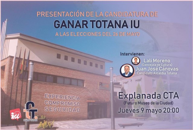 El próximo jueves, día 9 a las 20 horas, tendrá lugar el acto de presentación de la candidatura de Ganar Totana IU a las elecciones del 26 de mayo.