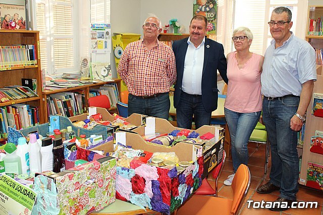 El alcalde, Andrés García, y la concejal de Cultura, Eulalia Moreno, han entregado a representantes de Cáritas en las dos parroquias de Totana, Santiago El Mayor y el Convento de las Tres Avemarías, los alimentos no perecederos y productos de aseo recogidos durante la campaña promovida por la biblioteca municipal "Mateo García" por los usuarios y usuarias de este servicio público con motivo del programa de actividades organizadas con motivo del Día del Libro.
