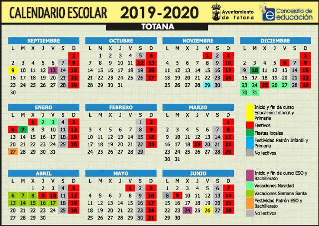 La Consejería de Educación aprobó hace unos días el calendario en los 45 municipios murcianos y se publicó en el BORM el pasado 31 de mayo. El Consejo Escolar Municipal de Totana remitió hace varias semanas su propuesta para el curso 2019/2020, que fue remitida a la Comunidad Autónoma de la Región de Murcia para su aprobación definitiva.
