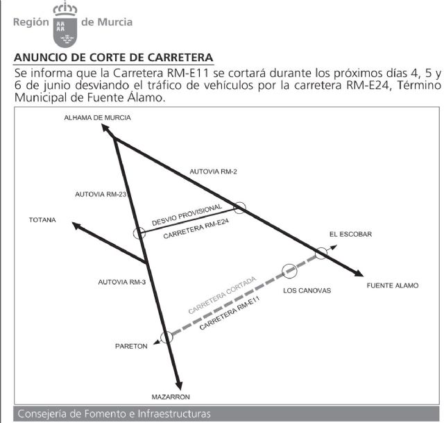 La Consejería de Fomento e Infraestructuras informa que la carretera RM-E11, que comunica El Paretón y las pedanías de Los Cánovas y El Escobar, en el término municipal de Fuente Álamo, permanecerá cortada del 4 al 6 de junio por el acondicionamiento de la vía.