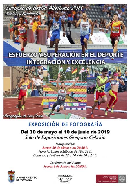 La Concejalía de Cultura informa que hoy jueves, 6 de junio, a las 20:00 horas, en la Sala de Exposiciones "Gregorio Cebrián" se contará con la presencia de Luis Conte, profesor del Departamento de la Actividad Física y el Deporte de la Universidad de Murcia, quien departirá coincidiendo con la muestra "Esfuerzo y superación en el deporte. Integración y excelencia".