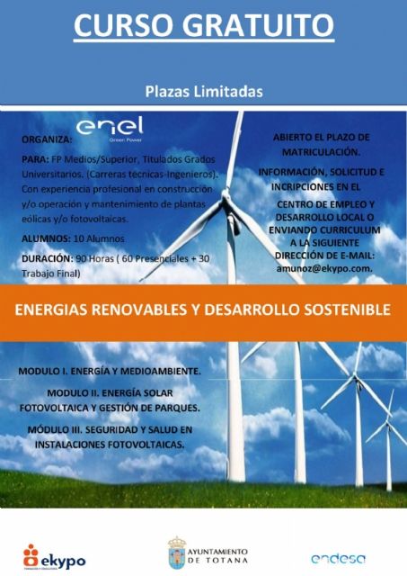 La Concejalía de Desarrollo Económico del Ayuntamiento de Totana y la empresa "Enel Green Power" ofertan un Curso de Energías Renovables y Desarrollo Sostenible, que está previsto celebrarlo durante este mes de junio en el Centro de Desarrollo Local, ubicado en el polígono industrial "El Saladar", y en cuya acción formativa todavía quedan plazas para las personas interesadas.