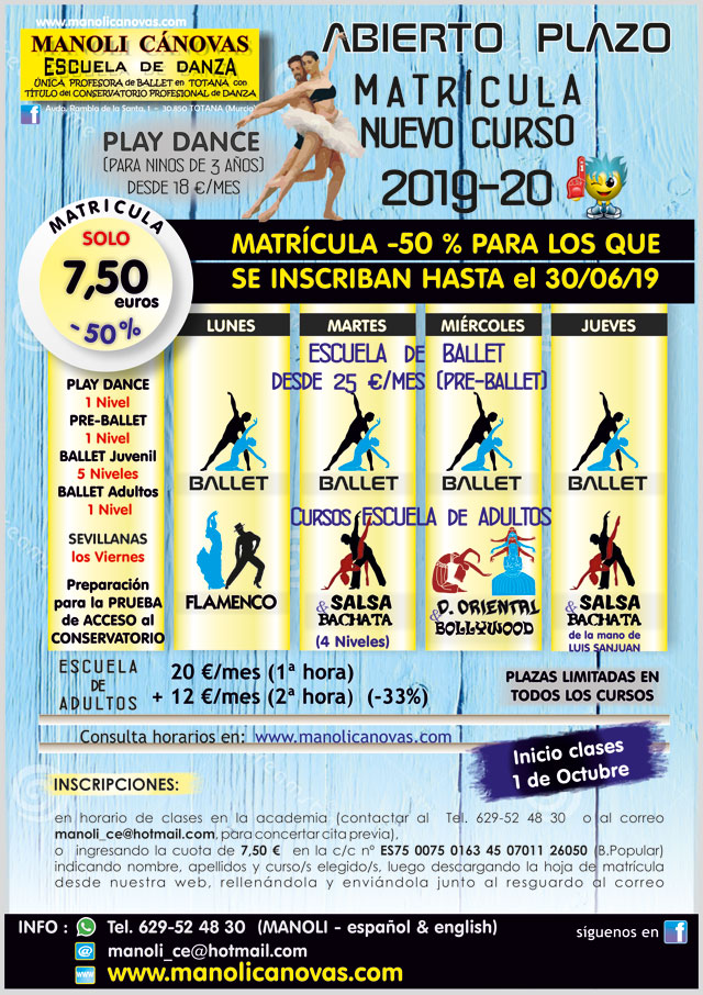 El período de inscripción con matrícula reducida al 50% será válido hasta el 30 de Junio. Para consulta de horarios y otro tipo de información se puede acudir a la página www.manolicanovas.com , en Facebook en Escuela de Danza Manoli Cánovas y por WhatsApp al 629-52 48 30.