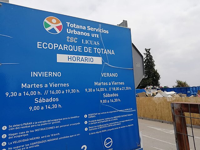 El horario del ecoparque municipal en los meses del verano, hasta el 15 de septiembre, es de 9:30 a 14:00 y de 18:00 a 21:30 horas, de martes a viernes; y los sábados de 9:00 a 14:30 horas, según recuerda la Concejalía de Medio Ambiente. En invierno, es el mismo horario pero las tardes es de 16:00 a 19:30 horas.