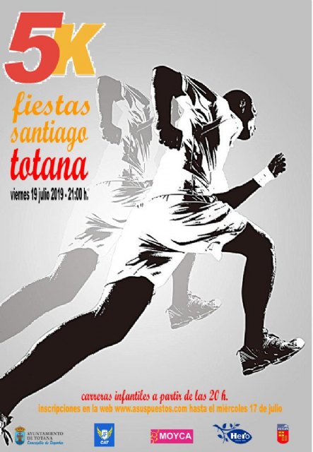 La Concejalía de Deportes del Ayuntamiento de Totana organiza, en colaboración con la Federación de Atletismo de la Región de Murcia, este viernes 19 de julio la prueba “5K Fiestas de Santiago”, enmarcada dentro del programa de festejos patronales de Totana 2019; cuyo plazo de inscripción finaliza mañana miércoles.