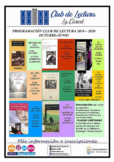 La primera sesión se celebrará el próximo 29 de octubre; y las personas interesadas en participar en este programa Club de Lectura para la nueva temporada han de efectuar sus inscripciones de manera presencial en las dependencias de la Biblioteca Municipal, y a través de teléfono 968/421089 o el correo electrónico iroman@totana.es