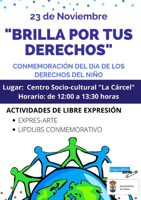 La Asociación Imperdible Social, con la inestimable colaboración de la Concejalía de Juventud, organiza el próximo sábado, día 23 de noviembre, la actividad "Brilla por tus derechos" para conmemorar el Día Internacional de los Derechos del Niños, que se celebra hoy; y que tendrá lugar en el Centro Sociocultural "La Cárcel".