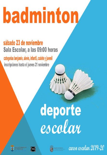 La Concejalía de Deportes organiza el próximo sábado 23 de noviembre la Fase Local de Bádminton de Deporte Escolar, a partir de las 9.00 horas, en la Sala Escolar, con la colaboración del Club de Bádminton Totana.